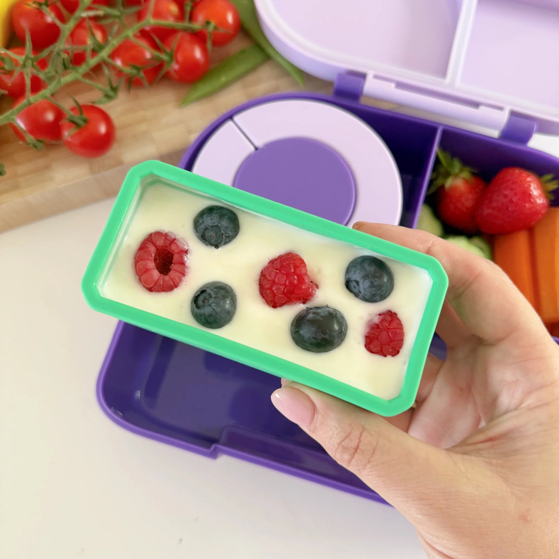 • Tökéletes például joghurtok, mártogatók vagy más puha ételek (pl. bogyós gyümölcsök) tárolására, akár kisebb kekszeket is tehetsz bele.