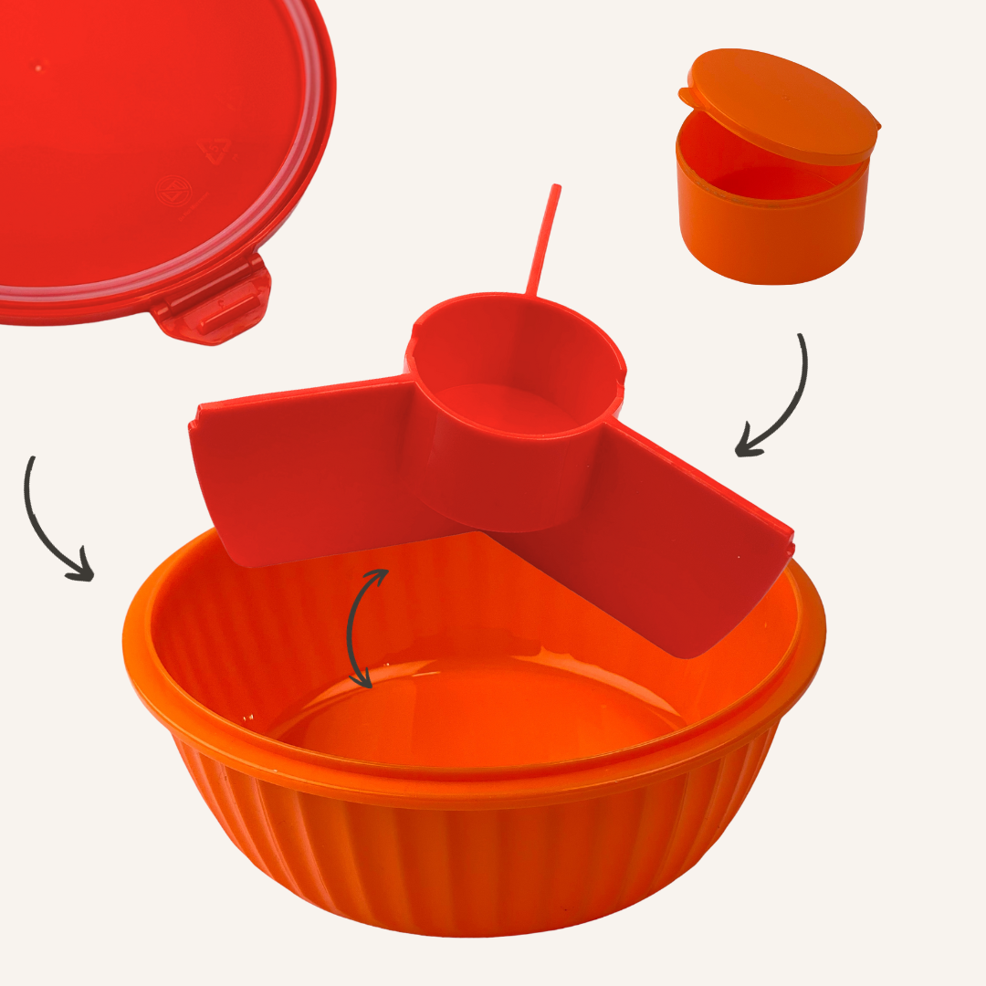 Salátás doboz (poké bowl) 3 nagy rekesszel, egy középső kis kerek rekesszel és egy beleillő kis tégellyel, önteteknek vagy szószoknak. A kis tégely és az elválasztó elem kivehető a dobozból. A salátás doboz teteje csöpögésmentesen zár, három csat rögzíti szorosan a tálhoz. A szilikon gyűrű kivehető a könnyebb tisztítás érdekében.