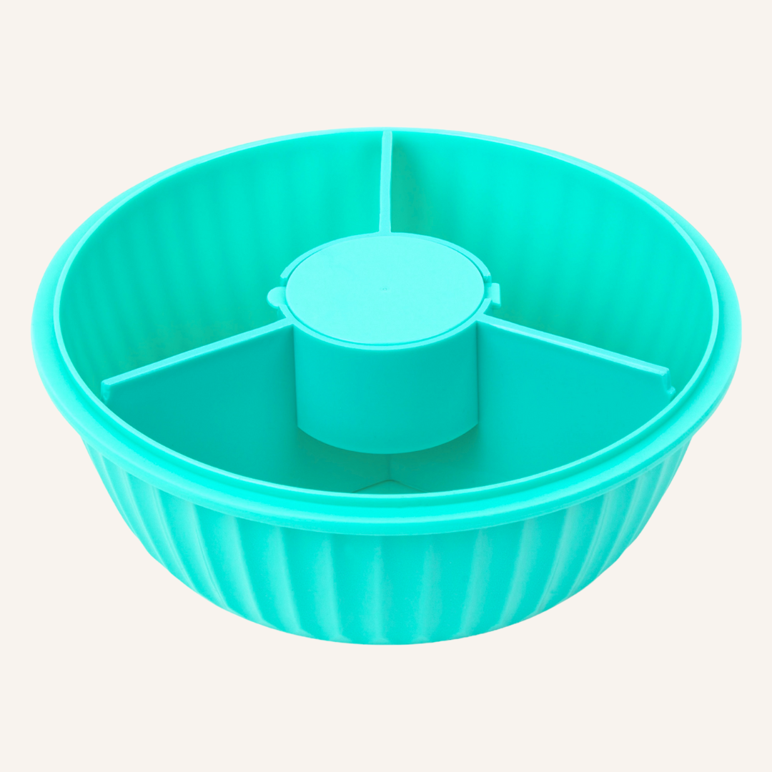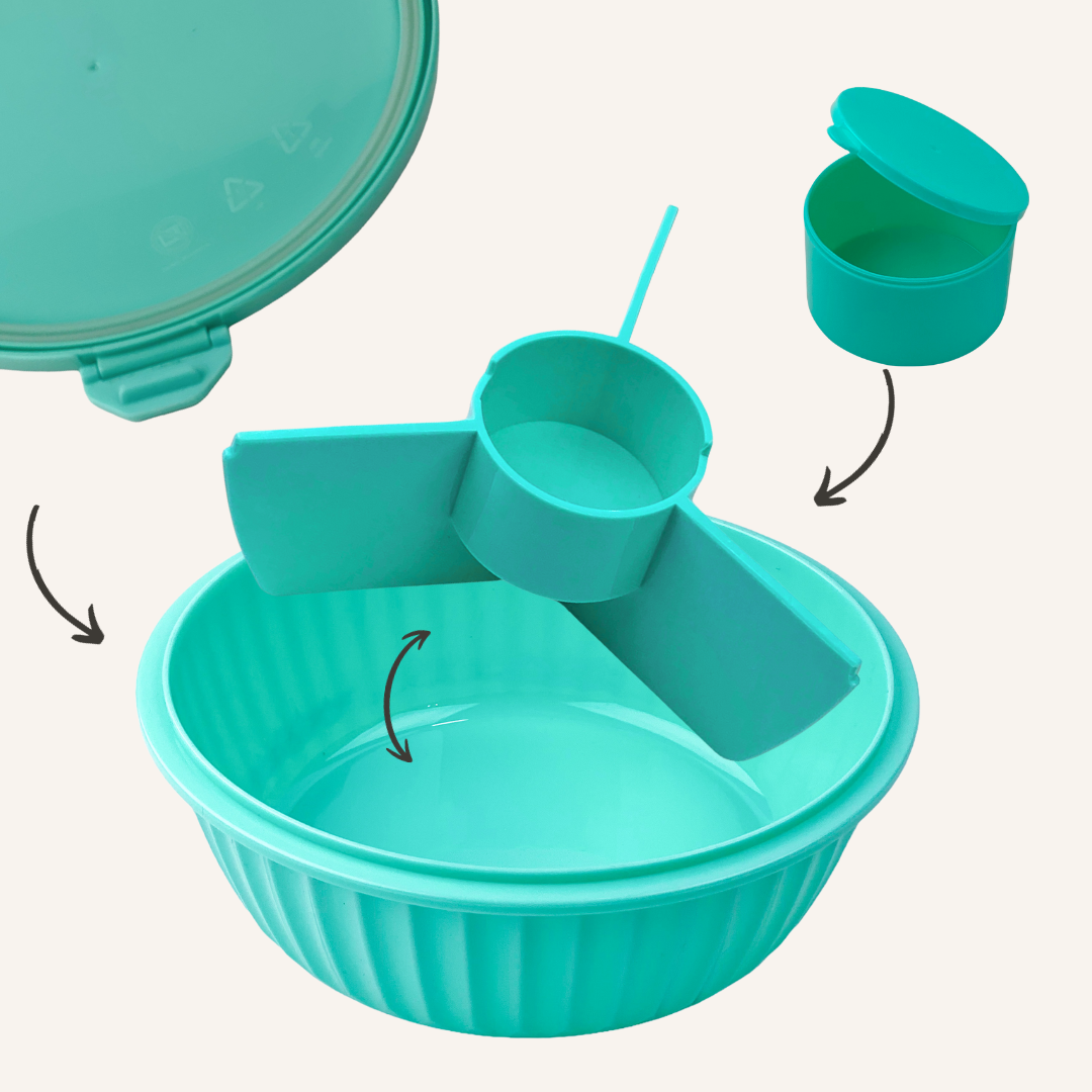Salátás doboz (poké bowl) 3 nagy rekesszel, egy középső kis kerek rekesszel és egy beleillő kis tégellyel, önteteknek vagy szószoknak. A kis tégely és az elválasztó elem kivehető a dobozból. A salátás doboz teteje csöpögésmentesen zár, három csat rögzíti szorosan a tálhoz. A szilikon gyűrű kivehető a könnyebb tisztítás érdekében.